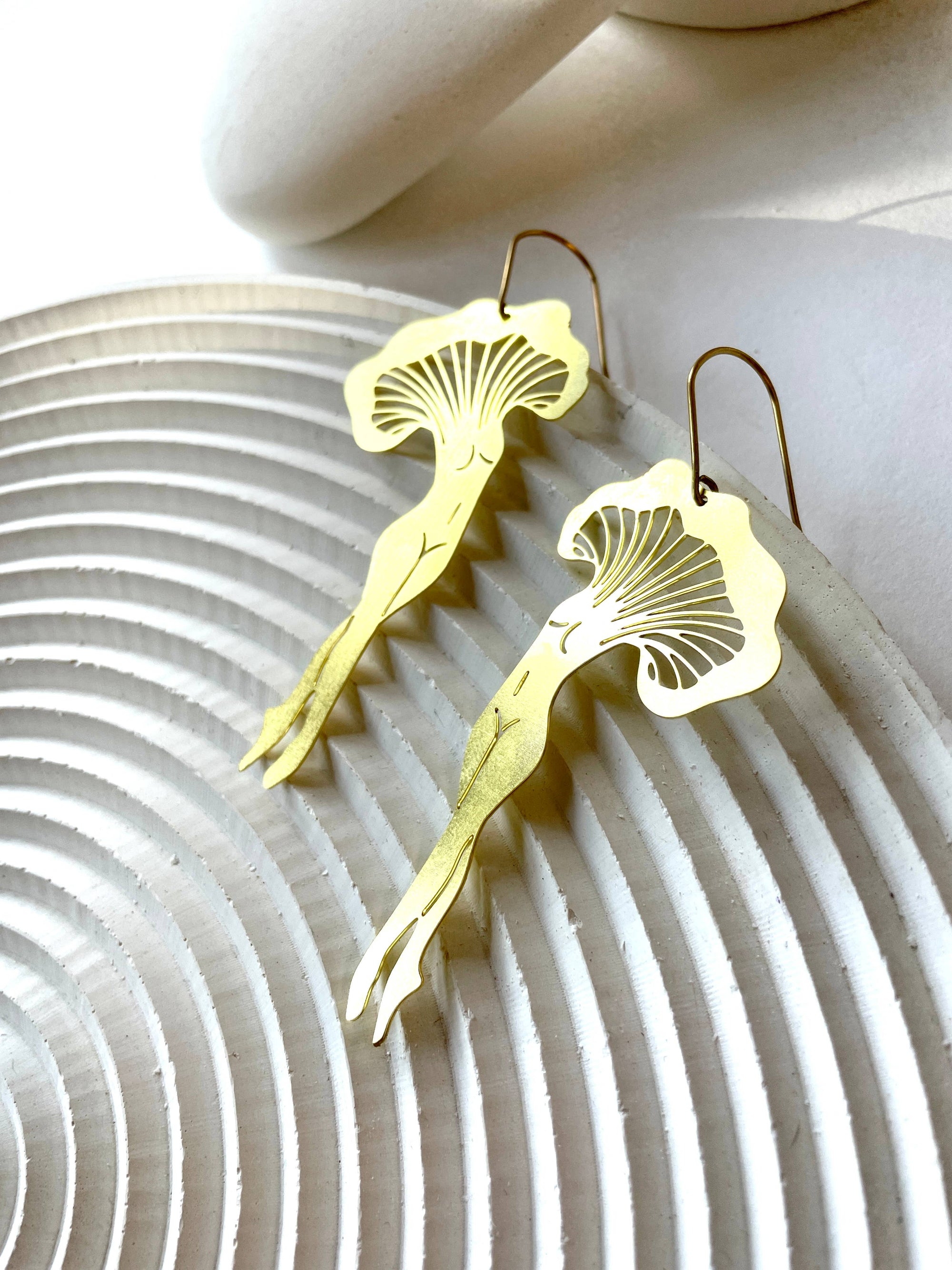 Brass lasercut mushroom lady earrings. Lightweight and easy to wear.