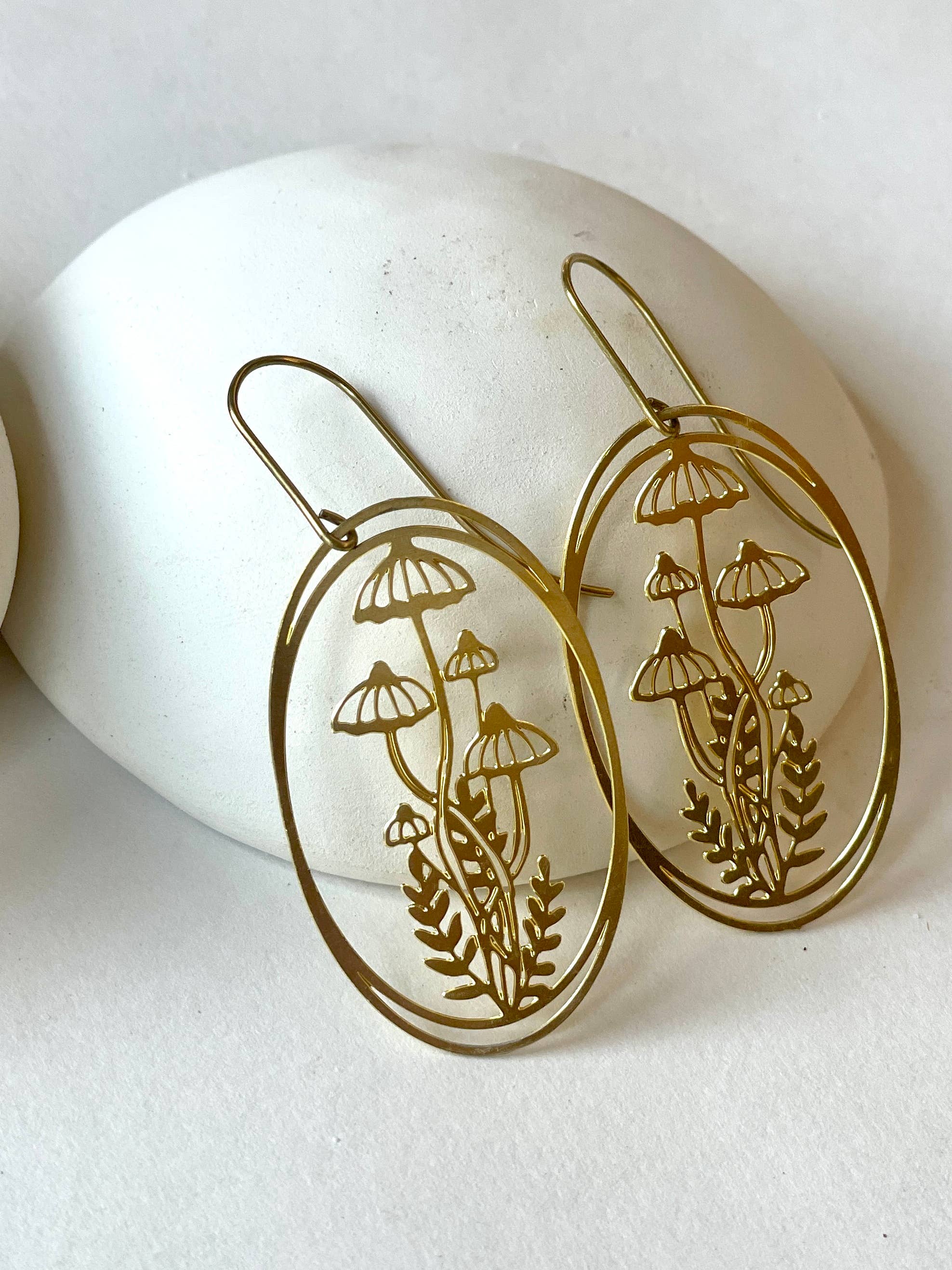 Delicate and detailed brass mushroom vignette earrings. Lightweight and easy to wear.