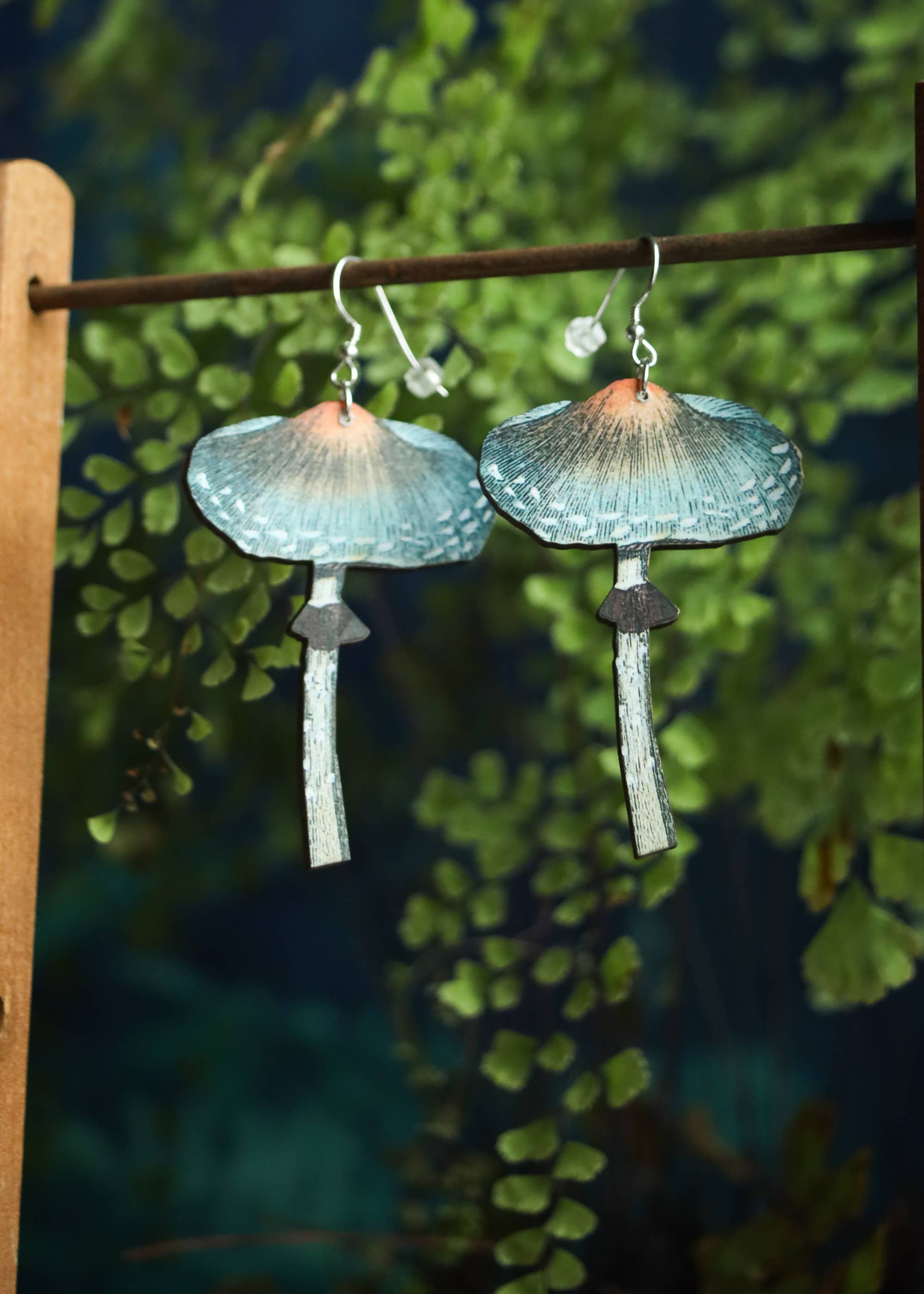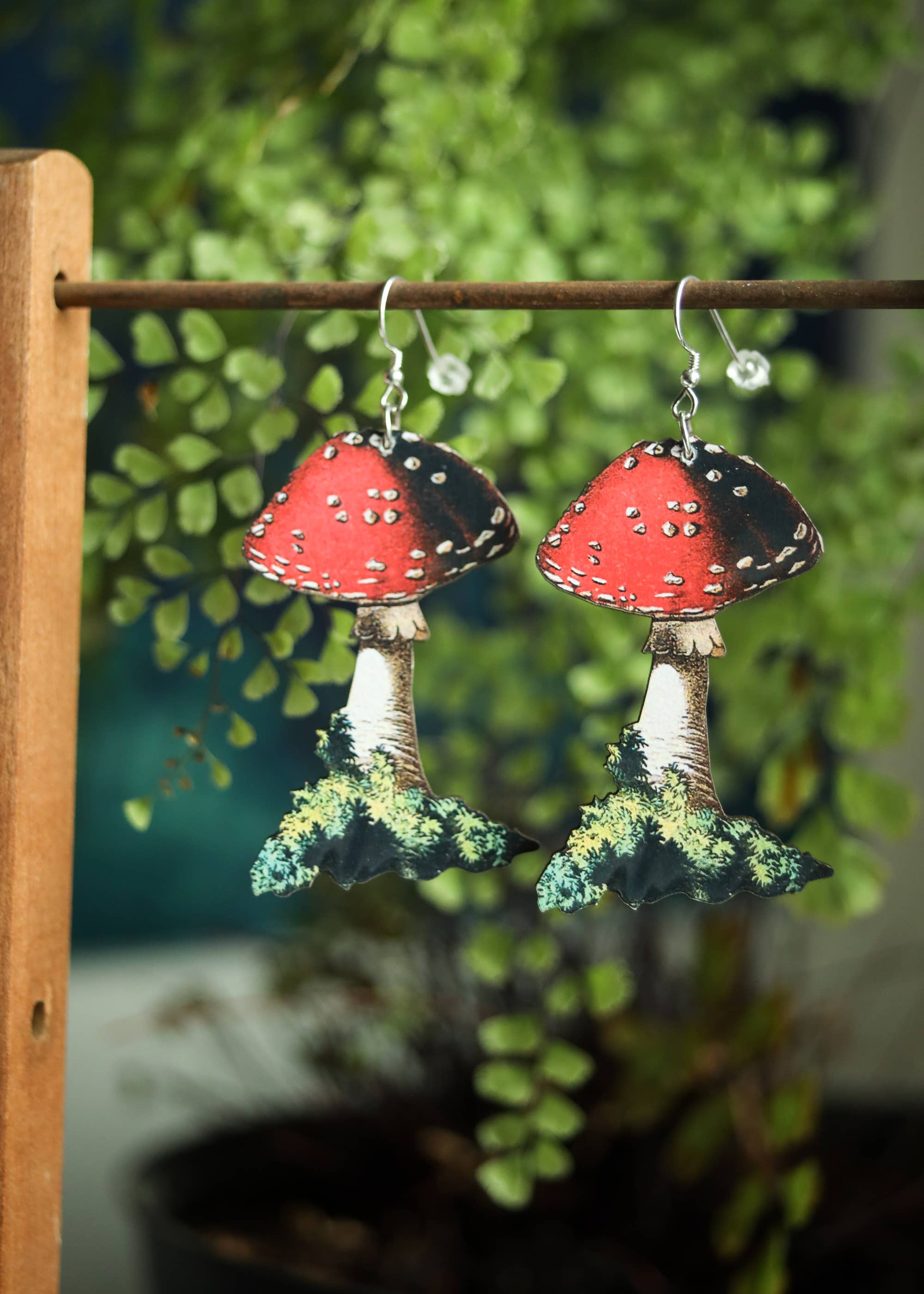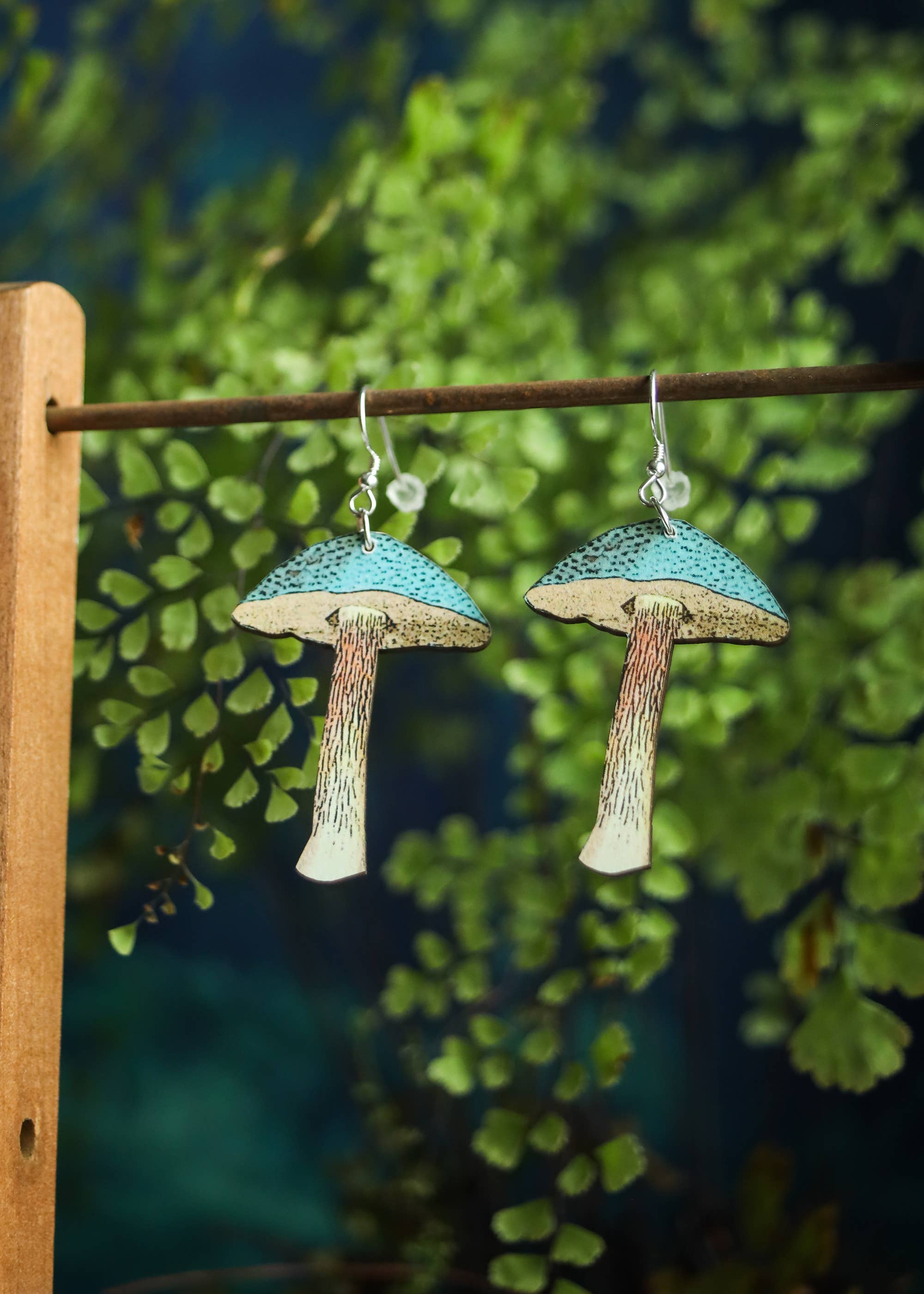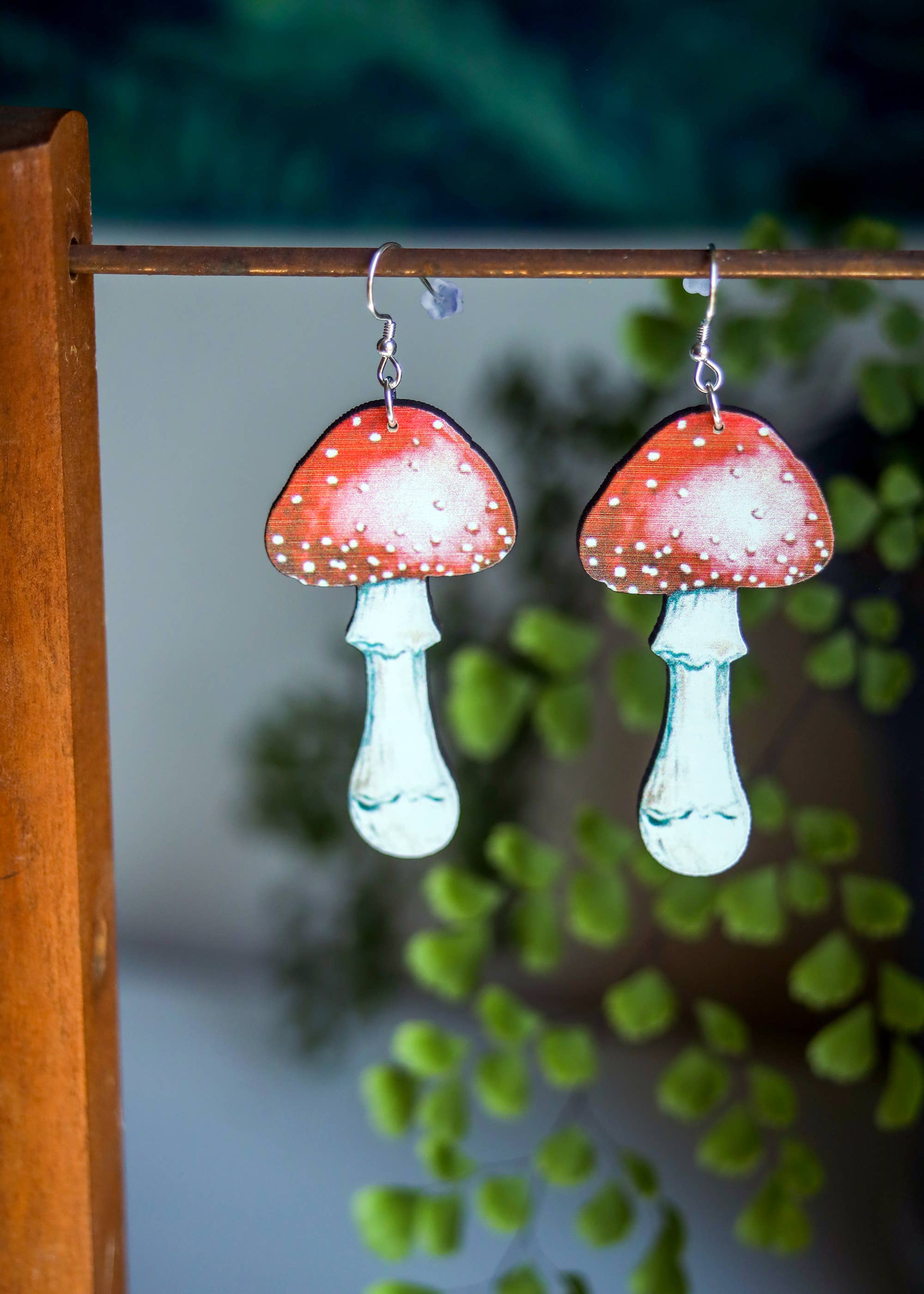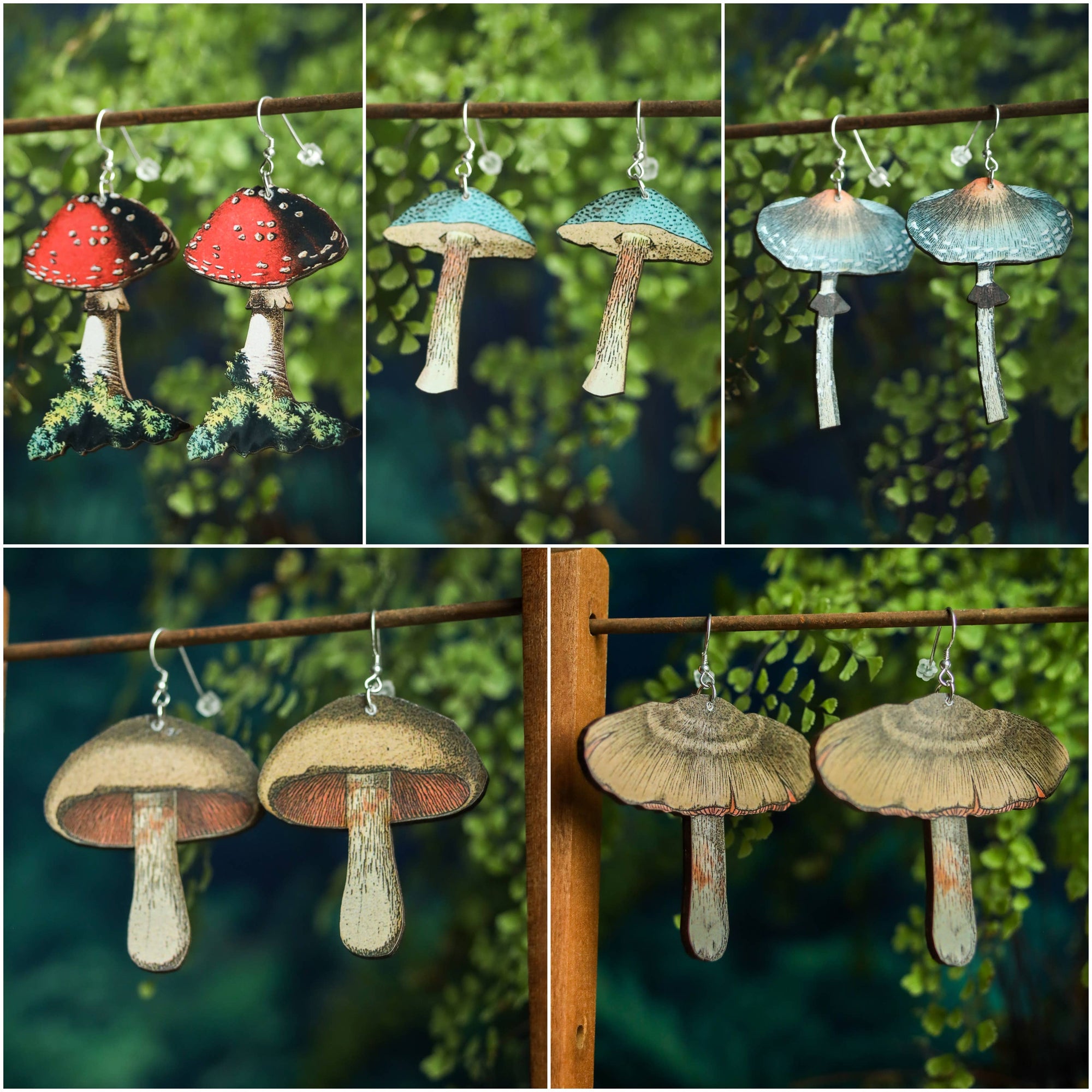 These adorable mushrooms are all the cottagecore vibes. Made from laser cut wood with photos of retro illustrations of various fungi. Very lightweight and perfectly dangle gently off your earlobe. Comes on stainless steel silver ear wires.