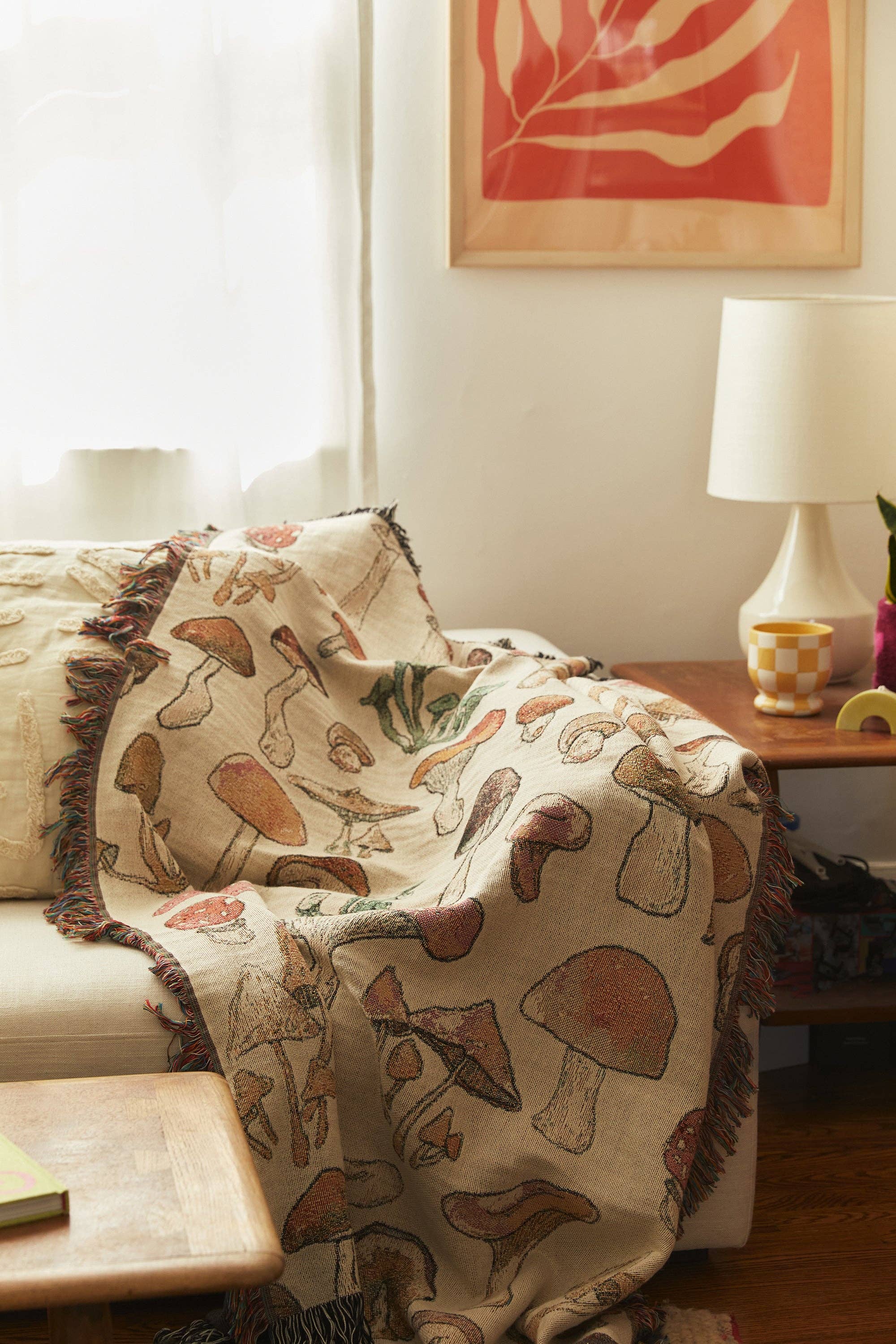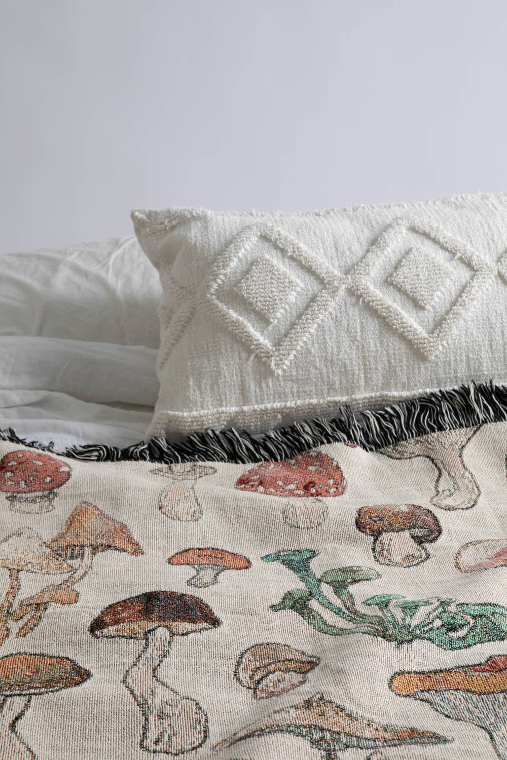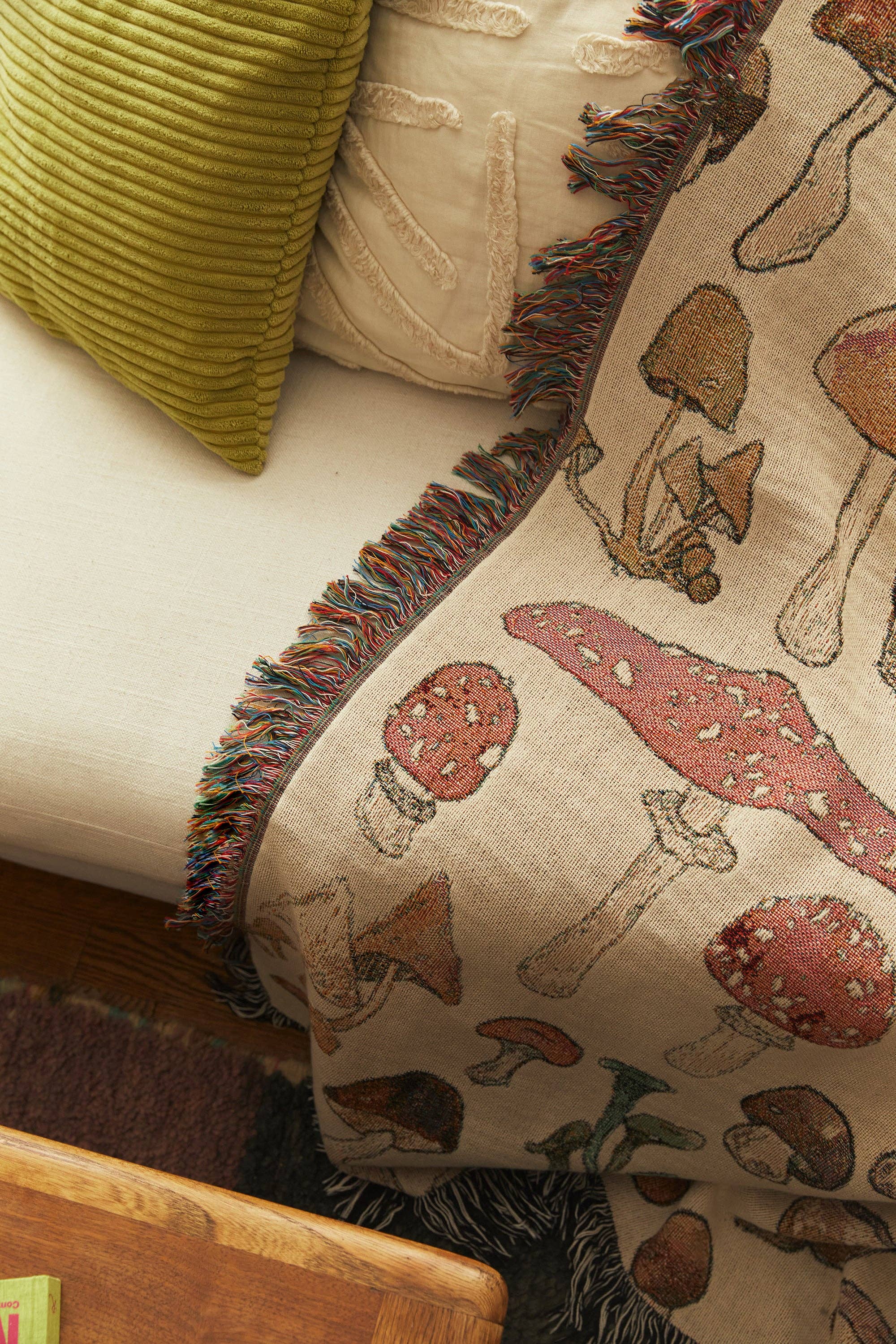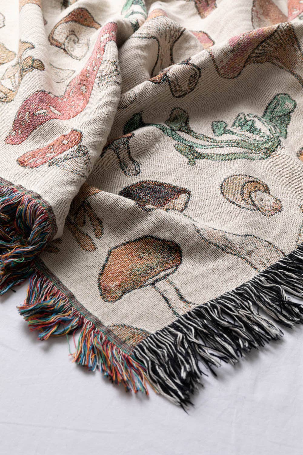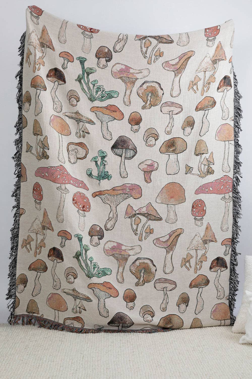 This colorful mushroom throw blanket features a collection of fungi decorated allover. Forest chanterelle and earthly toadstools are some of the mushroom types featured in our woven artwork. This mushroom blanket is perfect as a bedspread or for draping on your couch. Earth tone colors beautifully woven throughout with a faded vintage feel. Trimmed with multicolor fringed edges.