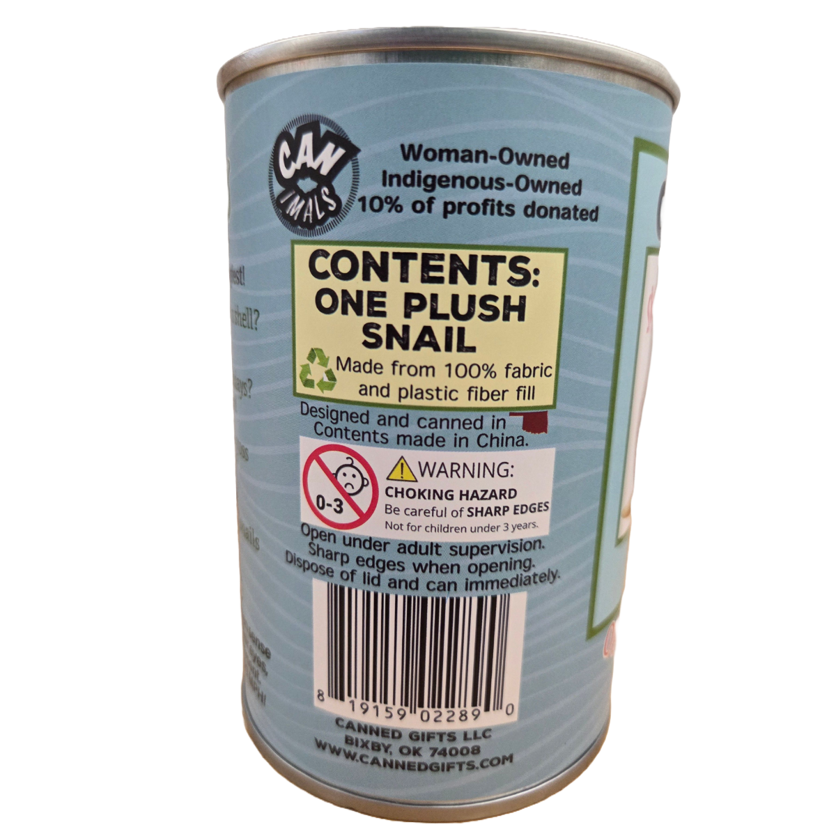 Included is 1 plush snail sealed in a soup can. Choose your lid style: standard, pop top, or foil.