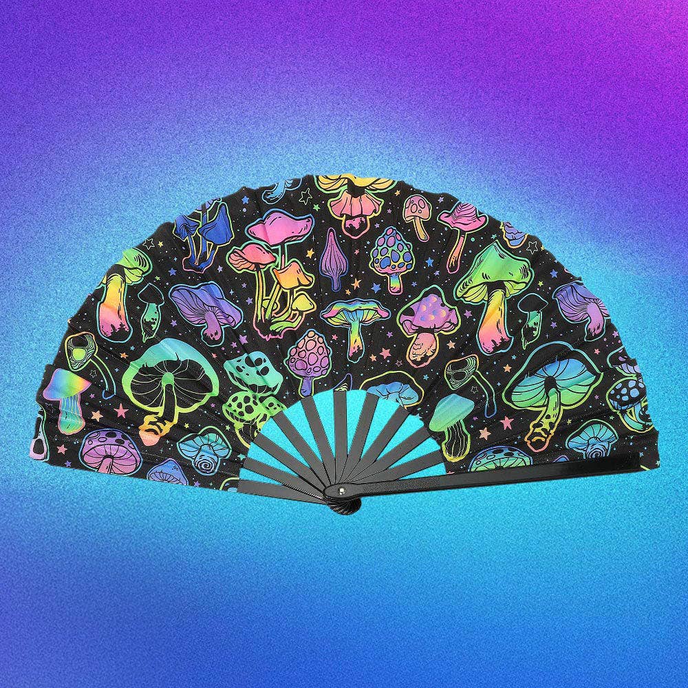 UV Glow Gradient Fluorescent Mushroom Pattern Printed Folding Line Dance Hand Fan
