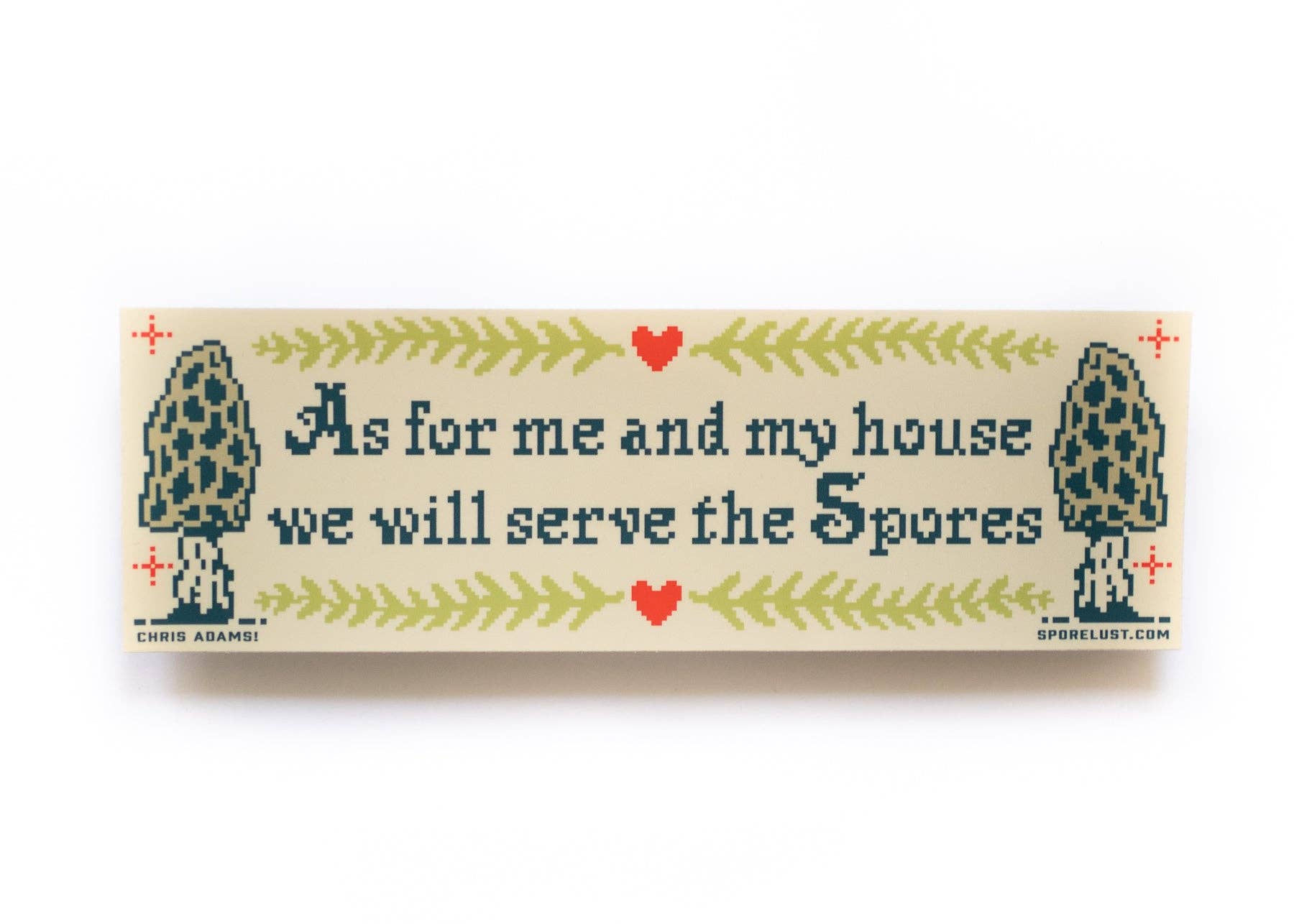 Cross stitching and morel mushroom sticker printed in the US and measures 8.5" x 2.75" on durable vinyl with a UV coating. Put one on your laptop, water bottle or 1986 Toyota Truck.